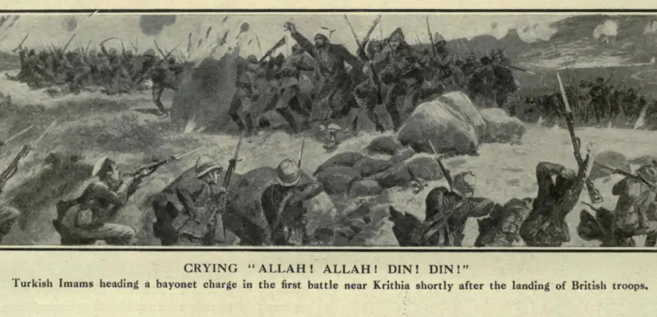 Gravür izah metni: İngiliz askerlerinin karaya çıkışından hemen kısa bir süre sonra, Alçıtepe yakınlarındaki ilk savaşta süngü hücumu başlatan Türk imamlar.