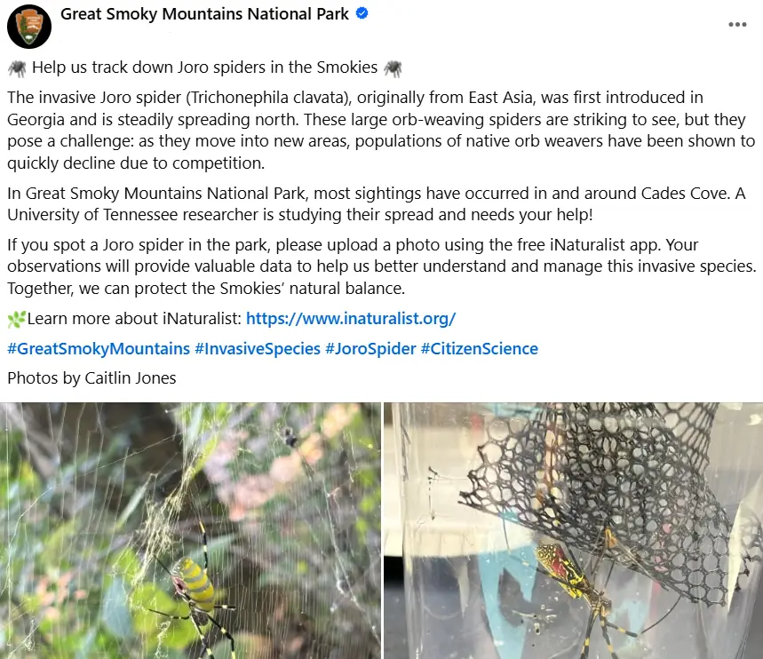 Boyutlarına rağmen Joro örümcekleri insanlar için genellikle zararsız kabul edilir. Zehirleri zayıftır ve küçük dişleri çoğu zaman insan derisini delmekte yetersiz kalır. Tennessee Üniversitesi’nden entomolog Karen Vail’in belirttiğine göre, bu örümcekler insanlara karşı agresif değillerdir ve oldukça çekingen bir yapıya sahiptirler. Ancak, Clemson Üniversitesi’nden orman sağlığı ve istilacı türler uzmanı David Coyle, Joro’ların ağlarını genellikle insanların uğrak yerlerine, özellikle de barınaklar ve sığınaklar gibi alanlara kurmayı sevdiklerini vurguluyor. Park içinde, bu örümcekler ağırlıklı olarak Tennessee tarafında yer alan dağlarla çevrili doğal bir vadi olan Cades Cove bölgesinde ve çevresinde gözlemlenmiştir. Bu bölge, ziyaretçilerin rahatlıkla erişebildiği 17,7 kilometrelik döngü bir yol ile çevrilidir. Bu gözlemler, yerel ekosistemi koruma çabaları için büyük önem taşımaktadır.